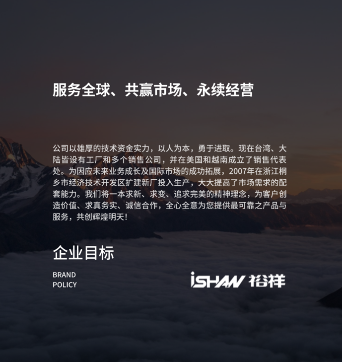 公司以雄厚的技術(shù)資金實力,以人為本,勇于進取。現(xiàn)在臺灣、大陸皆設(shè)有工廠和多個銷售公司,并在美國和越南成立了銷售代表處。為因應(yīng)未來業(yè)務(wù)成長及國際市場的成功拓展,2007年在浙江桐鄉(xiāng)市經(jīng)濟技術(shù)開發(fā)區(qū)擴建新廠投入生產(chǎn),大大提高了市場需求的配套能力。我們將一本求新、求變、追求完美的精神理念,為客戶創(chuàng)造價值、求真務(wù)實、誠信合作,全心全意為您提供最可靠之產(chǎn)品與服務(wù),共創(chuàng)輝煌明天!